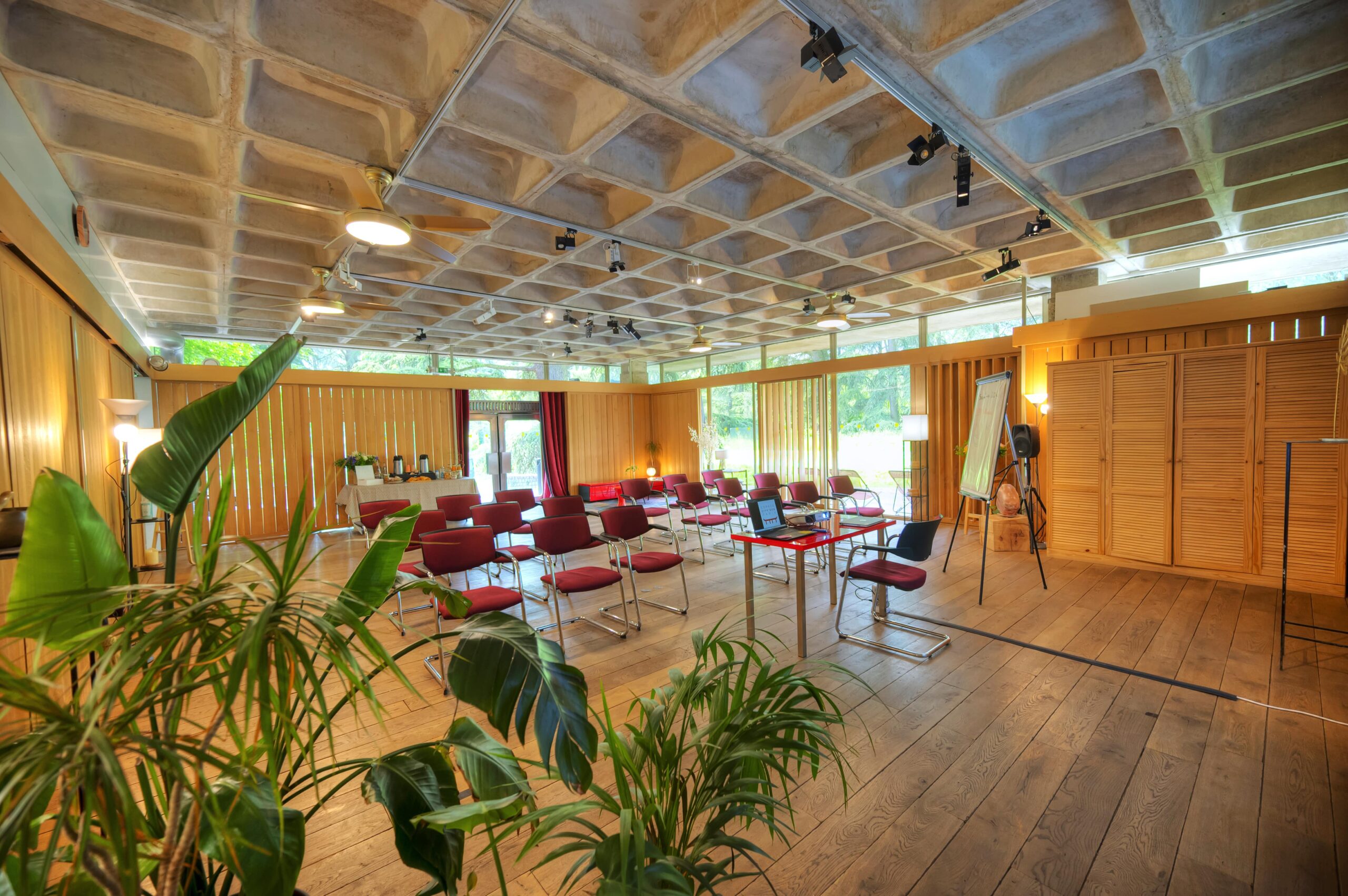 Des espaces de repli couverts avec vue sur la nature sont prévus en cas d’intempéries. Les équipements audiovisuels sont weatherproof (IP65) et les espaces semi-couverts permettent de maintenir le contact avec la nature même par temps mitigé. Un plan B est systématiquement préparé 48h avant l’événement.